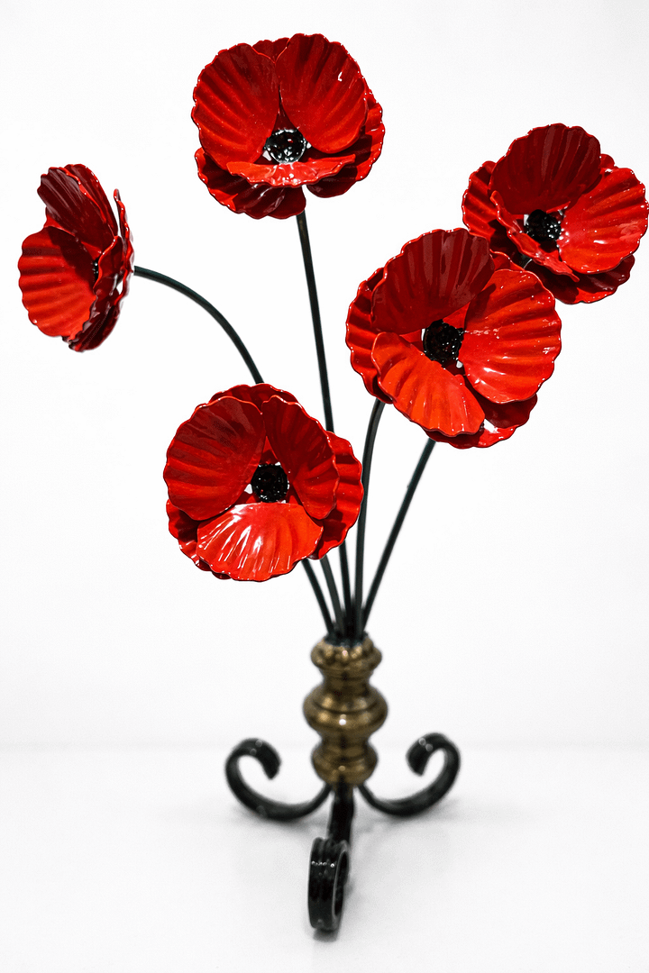 Each piece features hand-painted poppies with a varnished finish and a heavy-weight wrought iron stand, making it a striking and meaningful tribute. Please note, if placed outdoors, some colour fading may occur over time.